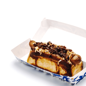 Brioche tierno y sabroso, con una salchicha alemana ahumada, cubierto de mozarella, cebolla pochada y bacon crujiente, bañado con salsa bbq Daad´s.