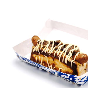 Brioche tierno y sabroso con una salchicha alemana rellena de queso gouda , bañado todo de queso cheddar picante y rabo de toro, terminado con una ligera mayonesa japonesa y un toque picante de siracha.