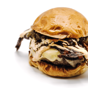 Tierno brioche, con carne de vaca vieja envuelta en queso ahumado , relish de pepinillo con cebolla morada y un bacon glaseado único, coronado con nuestra salsa burguer Daad´s.